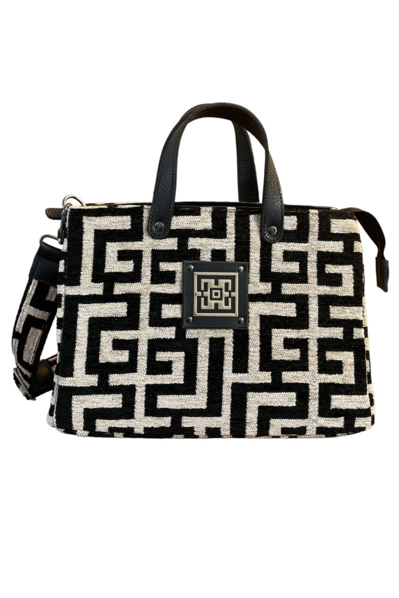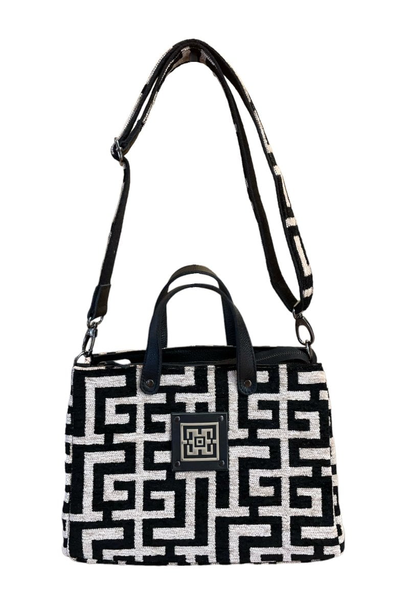 Η τσάντα Theseus είναι η επιλογή που συνδυάζει την κομψότητα με την πρακτικότητα στις καθημερινές σας εμφανίσεις. Κατασκευασμένη από σενίλ ύφασμα με μοναδικό σχέδιο λαβύρινθου και δερμάτινες λεπτομέρειες, αυτή η τσάντα διαθέτει μια αίσθηση υψηλής ποιότητας και αισθητικής.